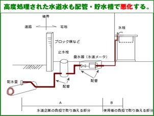 「貯水槽・受水槽」の汚れの問題です。集合住宅の場合配水量を確保するため、 一年中「貯水槽・受水槽」に一旦水道水を溜め、その後使用する形をとっています。「留まれば腐る」との言葉があるように、水は溜めこむと腐敗するのです。当然、「アオコ、藻」などが 「貯水槽・受水槽」の中に発生します。一度清掃時に中を確認されると良いと思います。